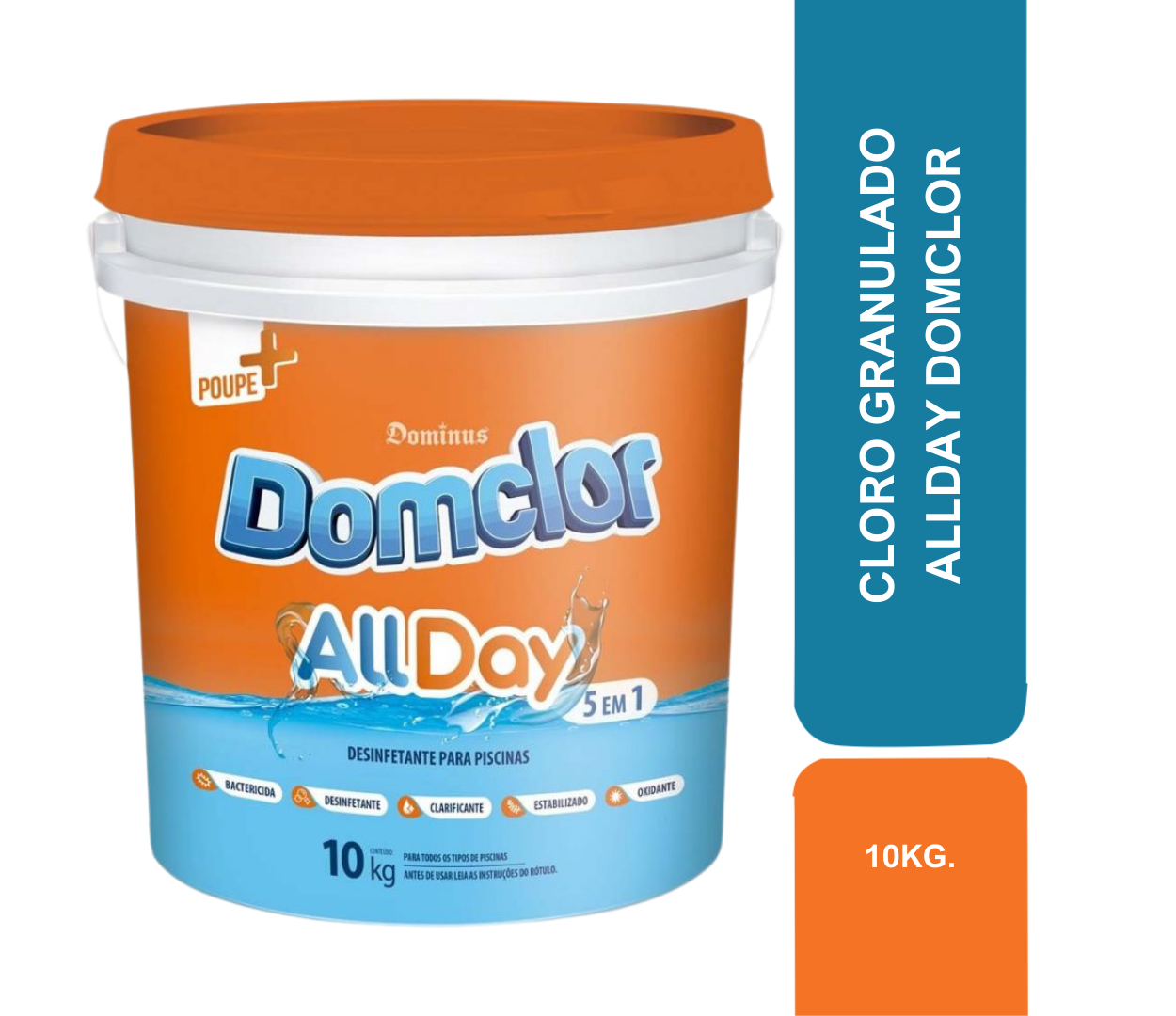 O Domclor AllDay é um composto clorado estabilizado (Dicloro Isocianurato de Sódio), o que significa que o cloro permanece ativo na água mesmo sob exposição solar intensa, ao contrário do cloro comum.